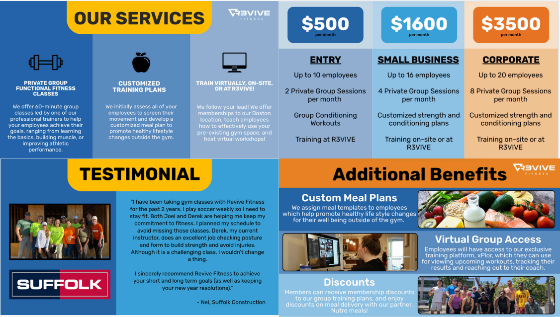 R3VIVE Fitness is a local Boston-area fitness center offering high-intensity functional training with personalized attention for all fitness levels. They came to NUMAC wanting a plan & strategy in targeting corporate clients and increasing visibility. We concentrated our efforts in research to develop deliverables including a Market Research Report, where we analyzed their competitors, audience segments, and actionable insights, Potential Leads, where we found 15 companies in the Boston area that could be reasonably attained, a usable Pitch Deck for those B2B clients, and strategy guides for Instagram, LinkedIn, and paid ads, complete with a mock content calendar.